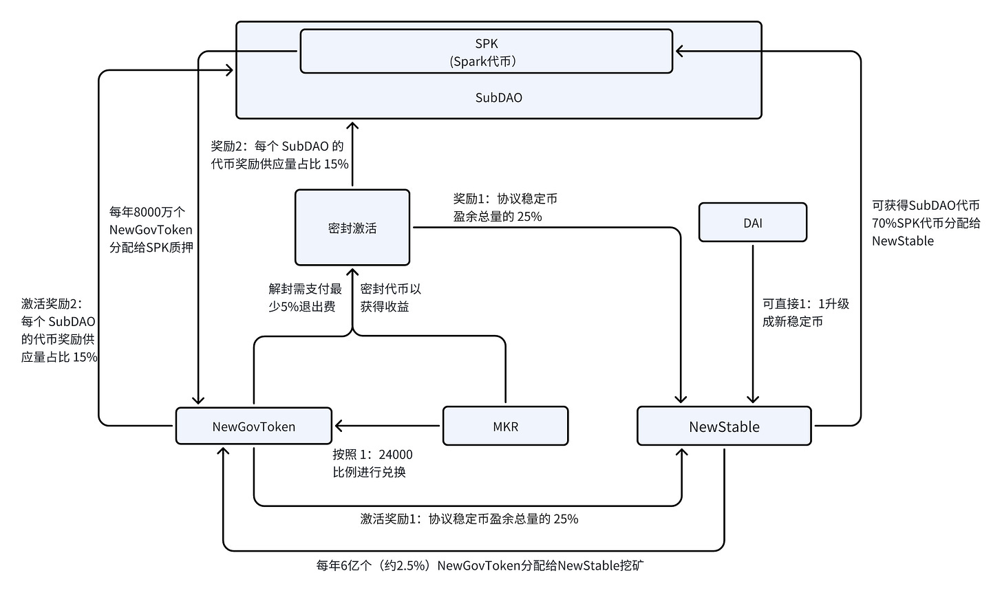 由DAI升级的新稳定币也将有赋能,每年可以挖矿获得6亿个(约2.5%)的NewGovToken,以及SubDAO代币。第一个SubDAO代币SPK就将分配70%给到新稳定币